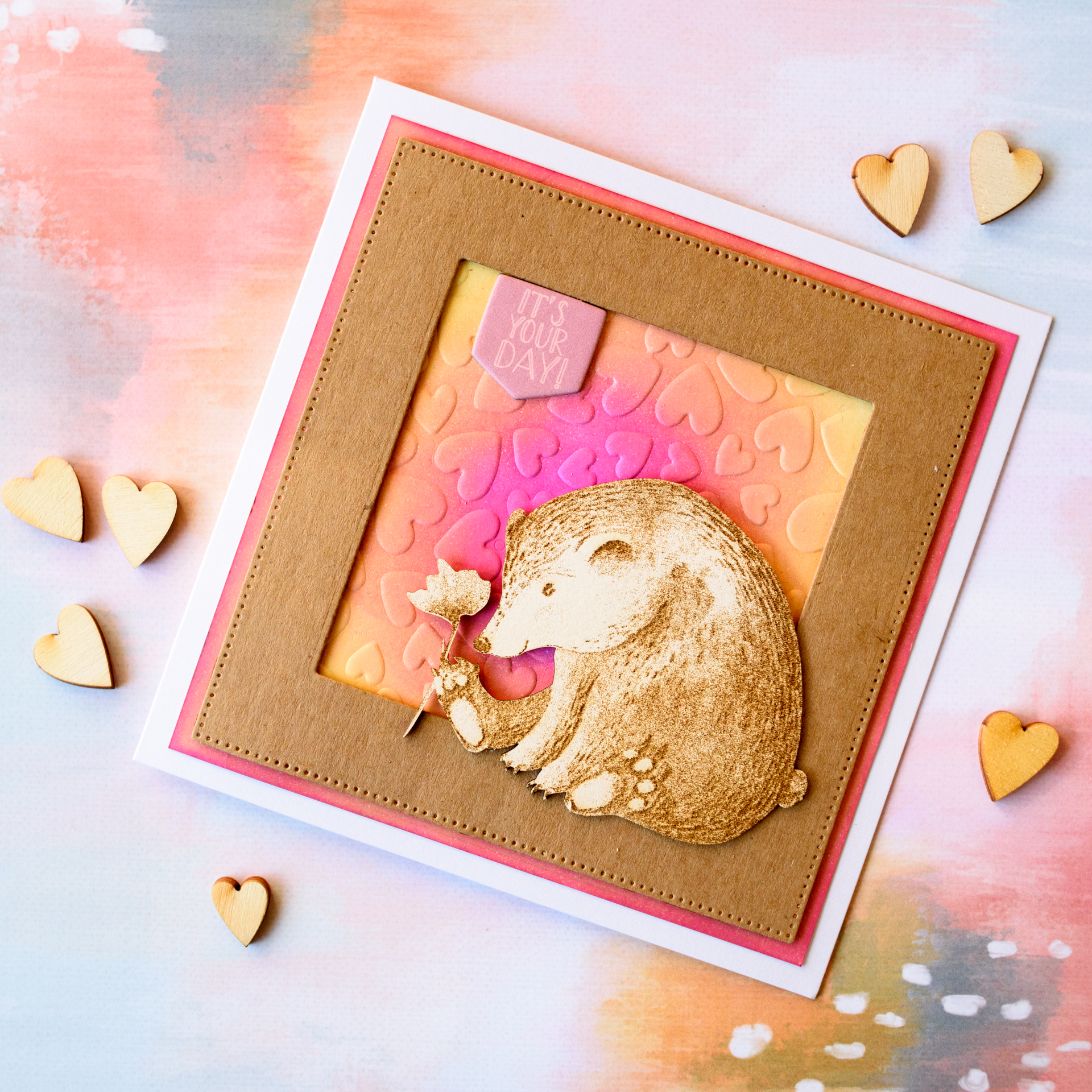 Chipboardy jsou hlavním motivem přáníček. Béžovou barvu, která se na nich objevuje jsem na přání zopakovala v podobě kraftového rámečku. A abych přáníčka trochu barevně oživila, vytvořila jsem si pozadí z distress inkoustů. Toto pozadí jsem ještě embossovala embossovací kapsou a dodala tak přáníčku jemnou texturu. Jako třešinku na dortu jsem přidala chipboardové nápisy z kolekce Let's Party od Studio 40.