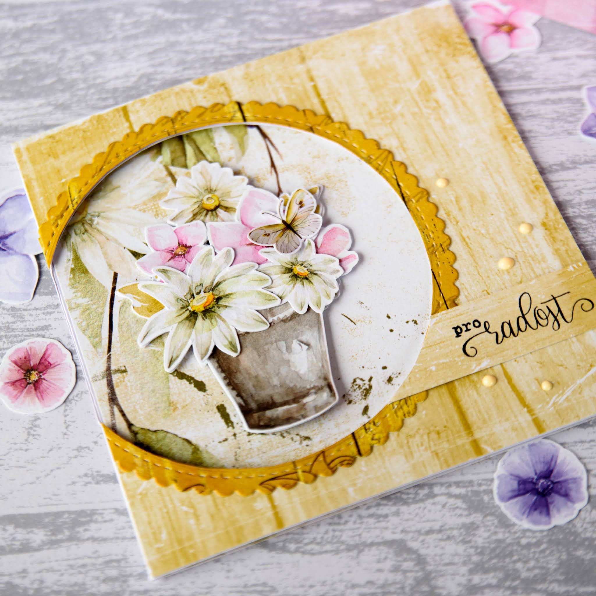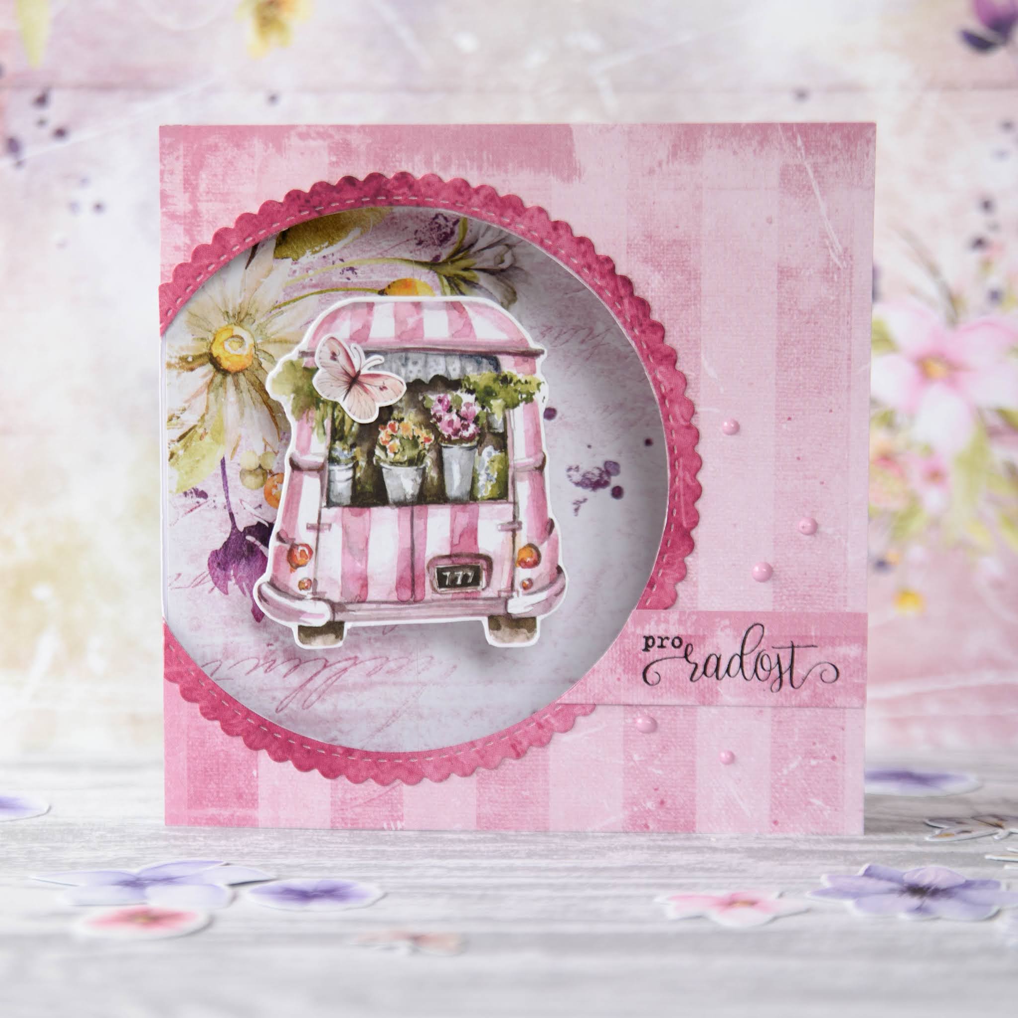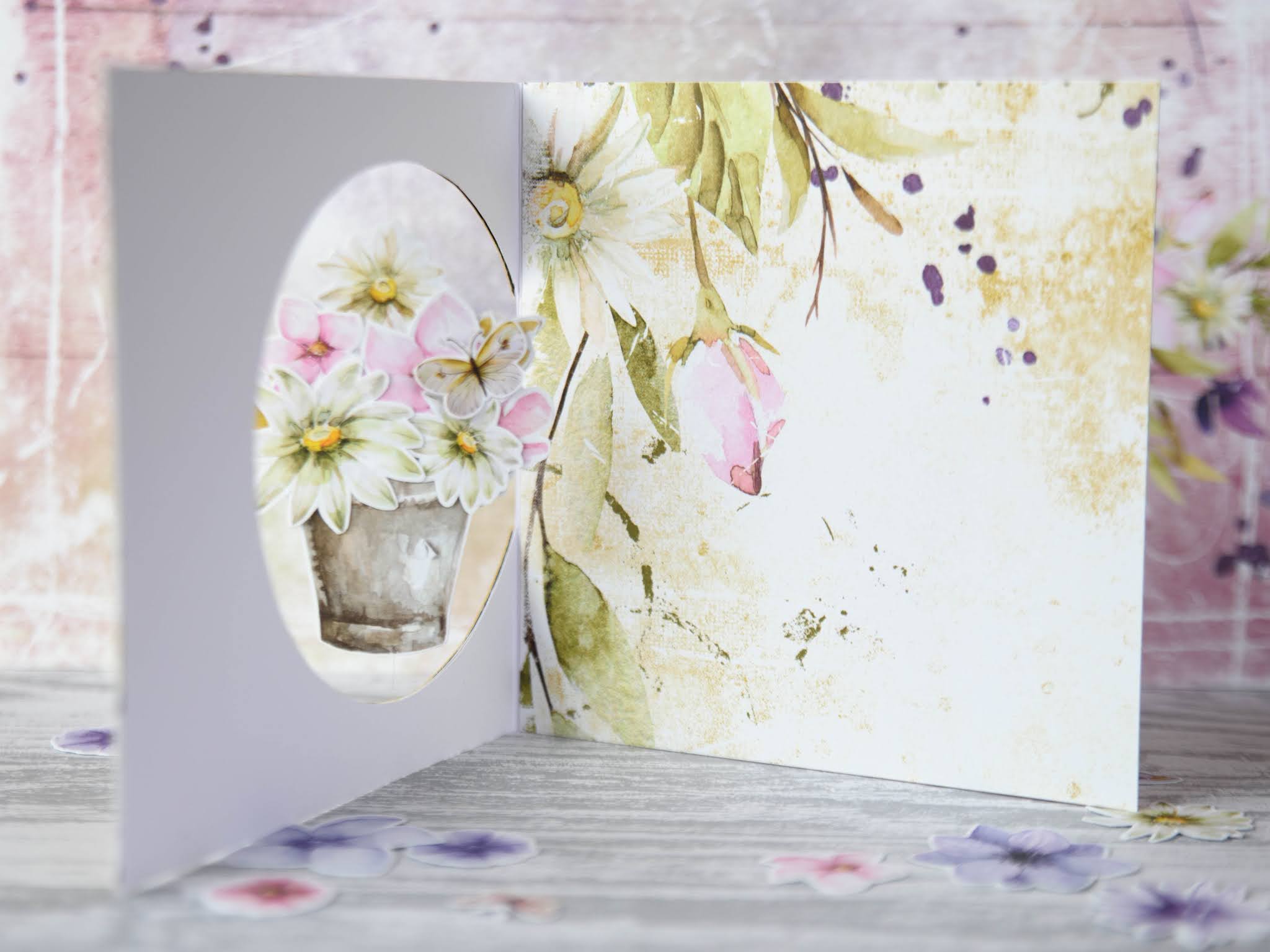 Když jsem v obchůdku narazila na kolekci Summer Flowers od Craft O'Clock, ke které je možné pořídit i oboustranně tištěné obrázky k vystřižení, dostala jsem nápad na tzv. spinner card neboli přáníčko s otočnými prvky.